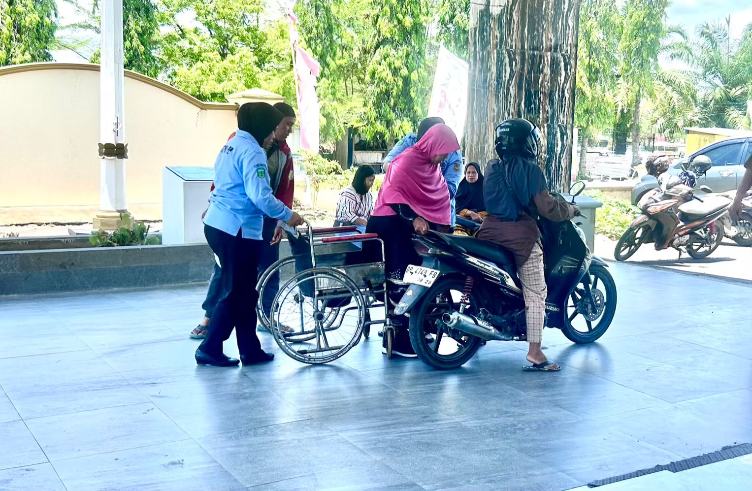 Dengan langkah cepat namun penuh kelembutan, keduanya membantu sang nenek duduk di kursi roda dan mendorongnya menuju pintu keluar. Tak berhenti di situ, mereka bahkan membantu menaikkannya ke atas motor sambil menebar senyum ramah yang tak pernah lepas dari wajah.